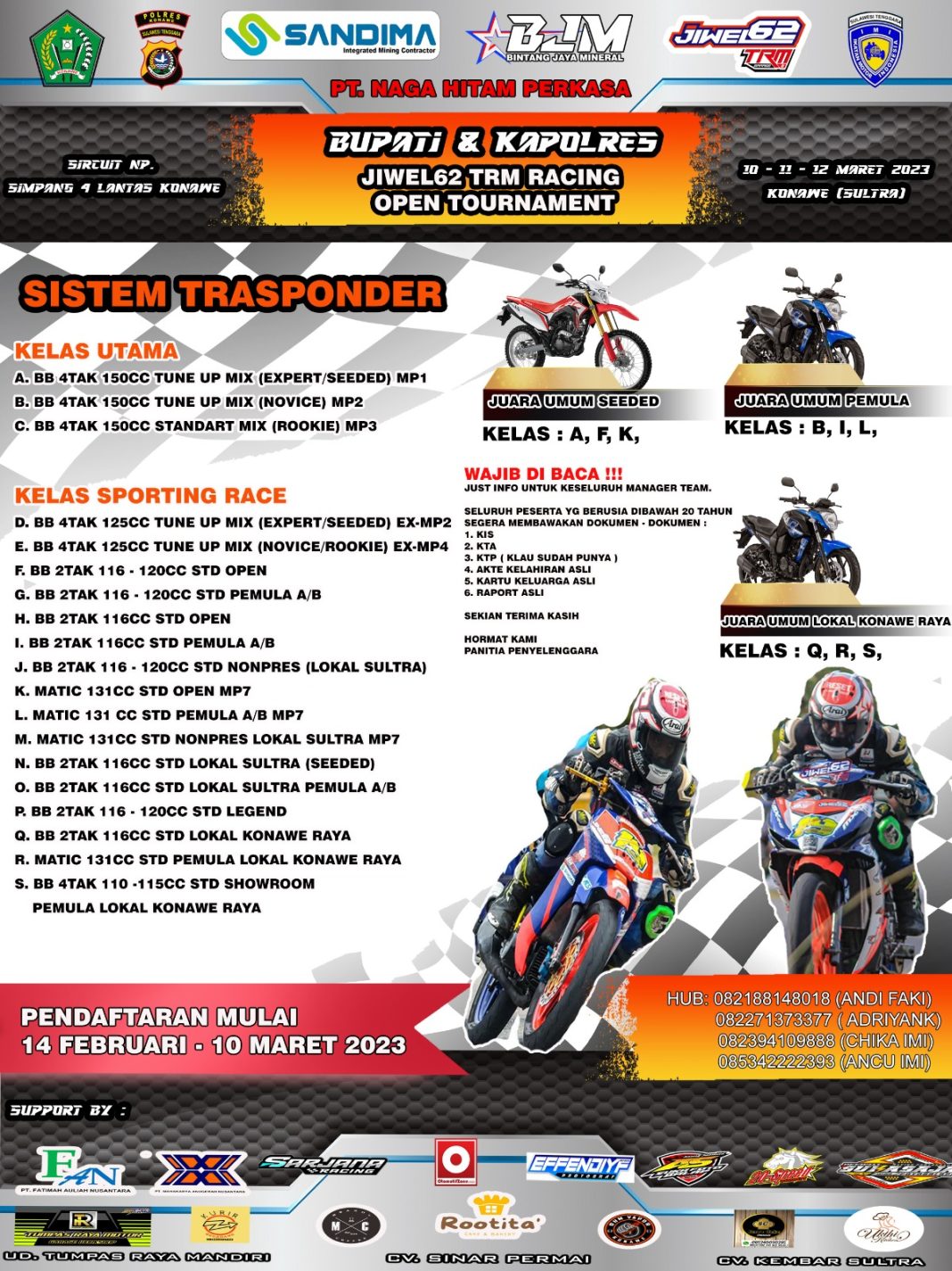Ketua Panitia Open Turnamen Jiwel 62 TRM Racing, Nasrullah Faizal, S.H., M.H. mengatakan, raider yang akan ikut dalam turnamen balap motor tersebut berasal dari berbagai daerah yakni dari Jawa Barat, Jakarta, Sulawesi Selatan, Gorontalo, Manado, dan banyak pula raider lokal yang akan ikut berpartisipasi.