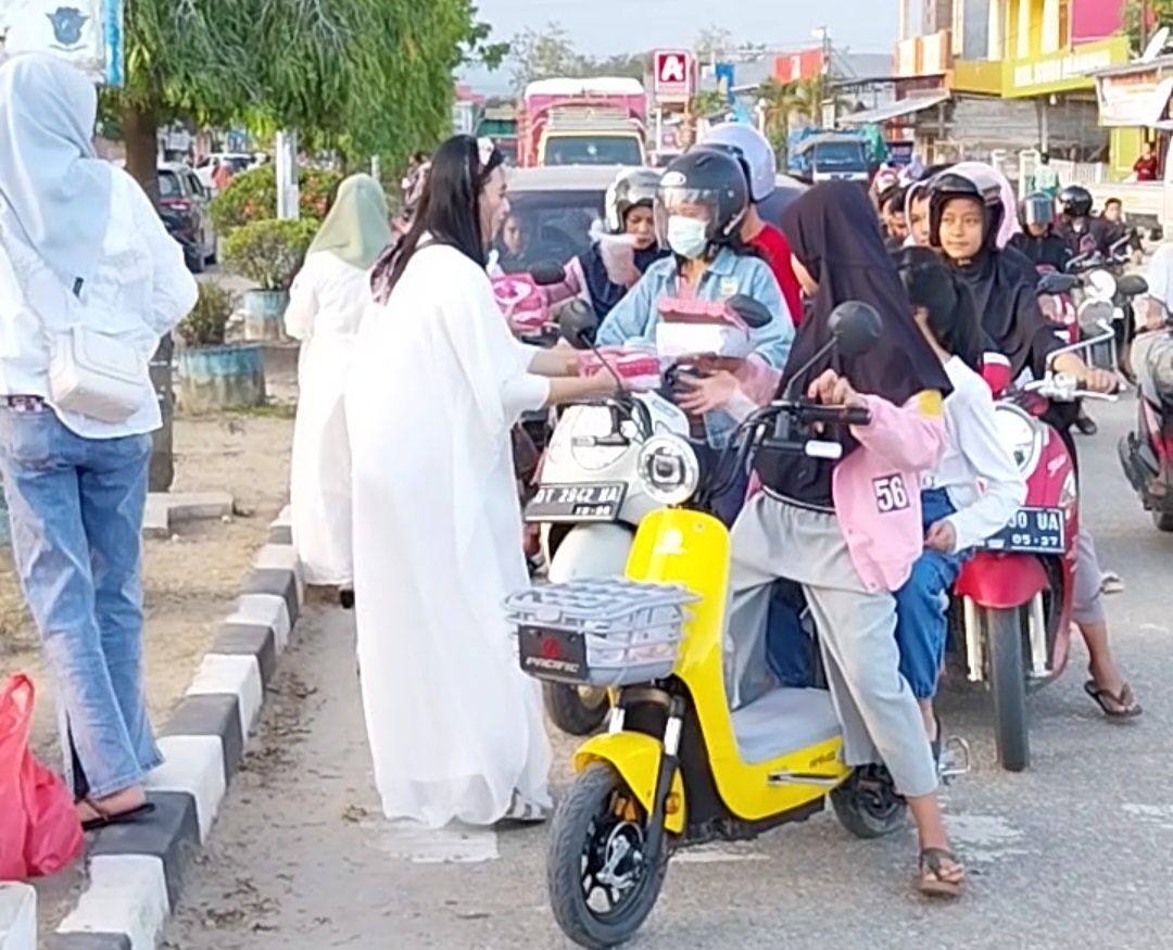 Komunitas anak muda yang mengedepankan solidaritas ini membagikan takjil sebanyak 1444 paket kepada sejumlah masyarakat yang melintas di jalan perempatan Pos Lantas Polres Konawe.