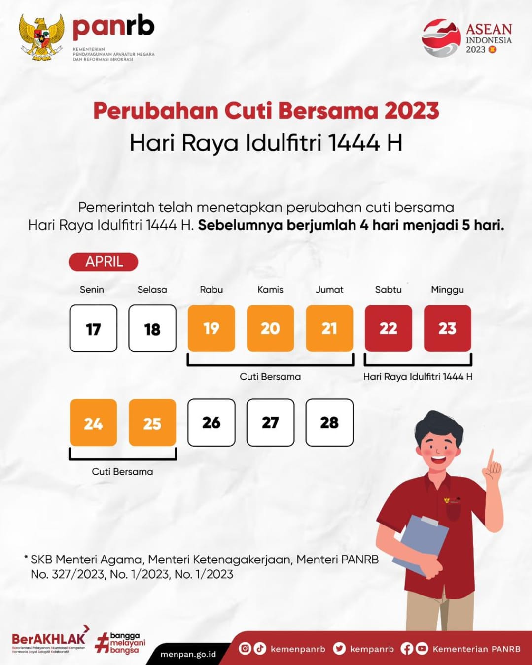 Hal itu brdasarkan SKB 3 Menteri (Mentri Agama, Mentri Ketenagakerjaan, Menteri PANRB) terbaru nomor : 327/2023 dan Keppres Nomor 8 Tahun 2023, Cuti lebaran bagi ASN mulai 19 April 2023 dan berakhir 25 April 2023.