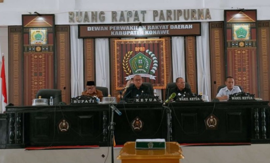 Unaaha,Anoapress.com- Dewan Perwakilan Rakyat Daerah (DPRD) Konawe, terima Rancangan Peraturan Daerah (Raperda), dari Penjabat (Pj) Bupati Konawe, Harmin Ramba, yang turut dihadiri oleh Ketua DPRD Konawe, Ardin, wakil ketua I, Tajuddin Dongge, wakil ketua II, Rusdianto, beserta beberapa anggota DPRD, Sekretaris Daerah (Sekda) Konawe, Ferdinand Sapan, Kapolres Konawe, Ahmad Setiadi, perwakilan Kajari Konawe, dan para pimpinan Organisasi Perangkat Daerah (OPD) lingkup Konawe, di gedung rapat DPRD Konawe. Senin, (26/2/2024).