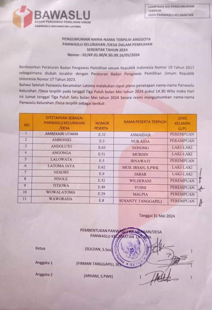 Unaaha,Anoapress.com- Panitia Pengawasan Pemilihan Umum (Panwaslu) Kecamatan Latoma telah mengumumkan 11 nama calon anggota Panwaslu Kelurahan/Desa (PKD) terpilih dalam rangka Pemilukada Konawe tahun 2024 mendatang.