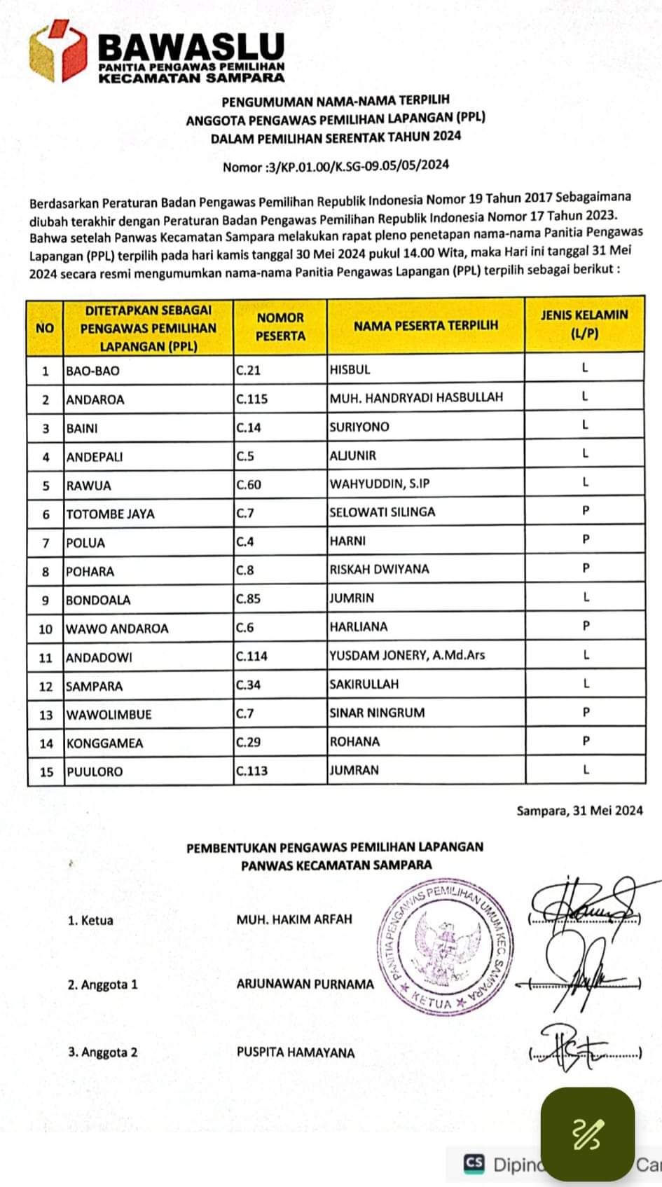 Pengumuman resmi ini didasarkan pada Surat Keputusan Panwaslu Kecamatan Sampara Nomor: 03/KP.01.00/K.SG-01.05/05_2024