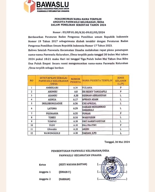 Unaaha,Anoapress.com- Panitia Pengawasan Pemilihan Umum (Panwaslu) Kecamatan Unaaha umumkan 12 nama anggota Panwaslu Kelurahan/Desa (PKD) terpilih dalam rangka Pemilukada Konawe tahun 2024 mendatang.